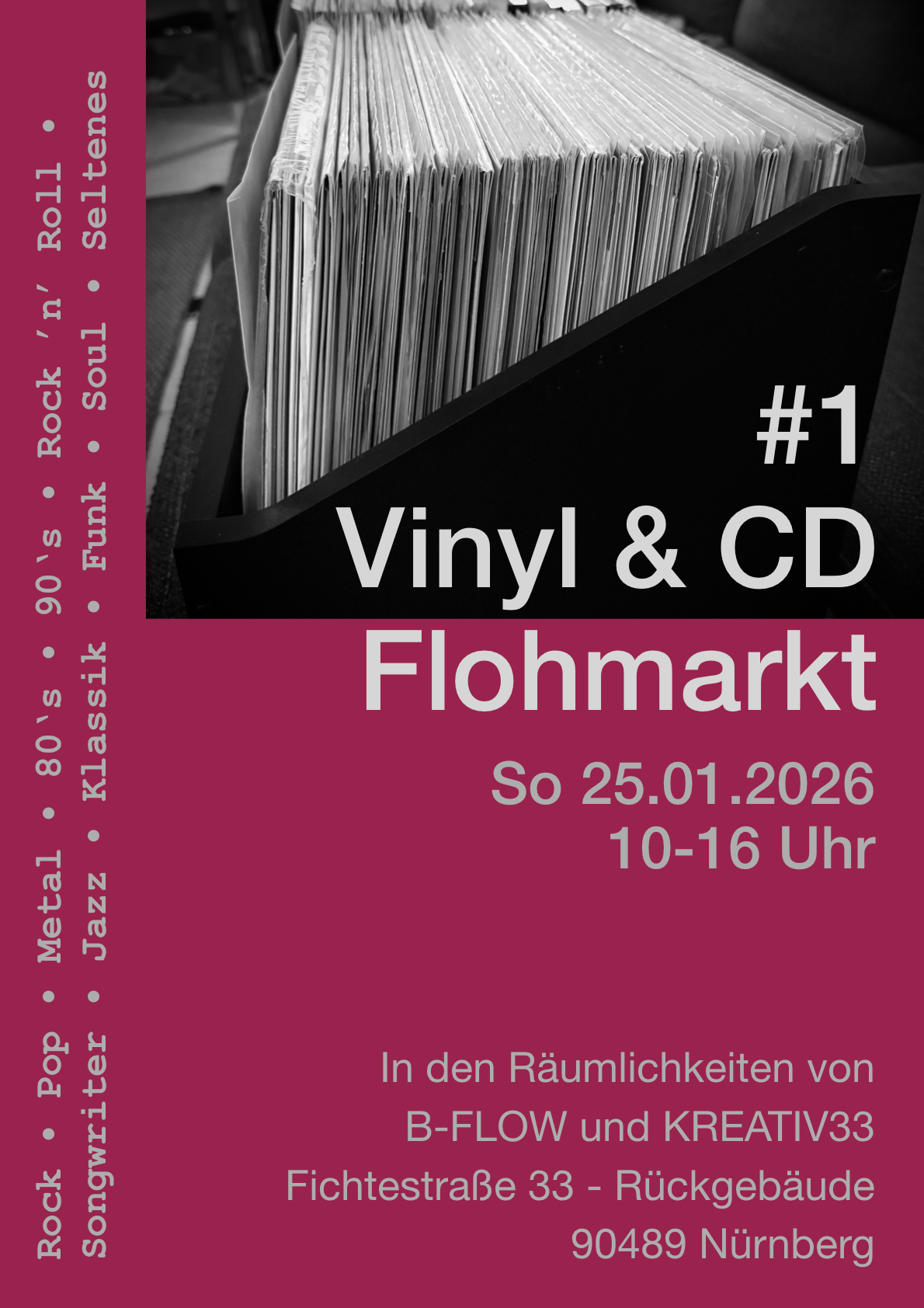 Der Flohmarkt findet in den Räumlichkeiten von B-FLOW und KREATIV33 statt, genauer gesagt in der Fichtestraße 33 (Rückgebäude), 90489 Nürnberg. Perfekt für alle, die Lust haben, mal wieder durch Kisten zu blättern und echte Musik-Raritäten zu entdecken.