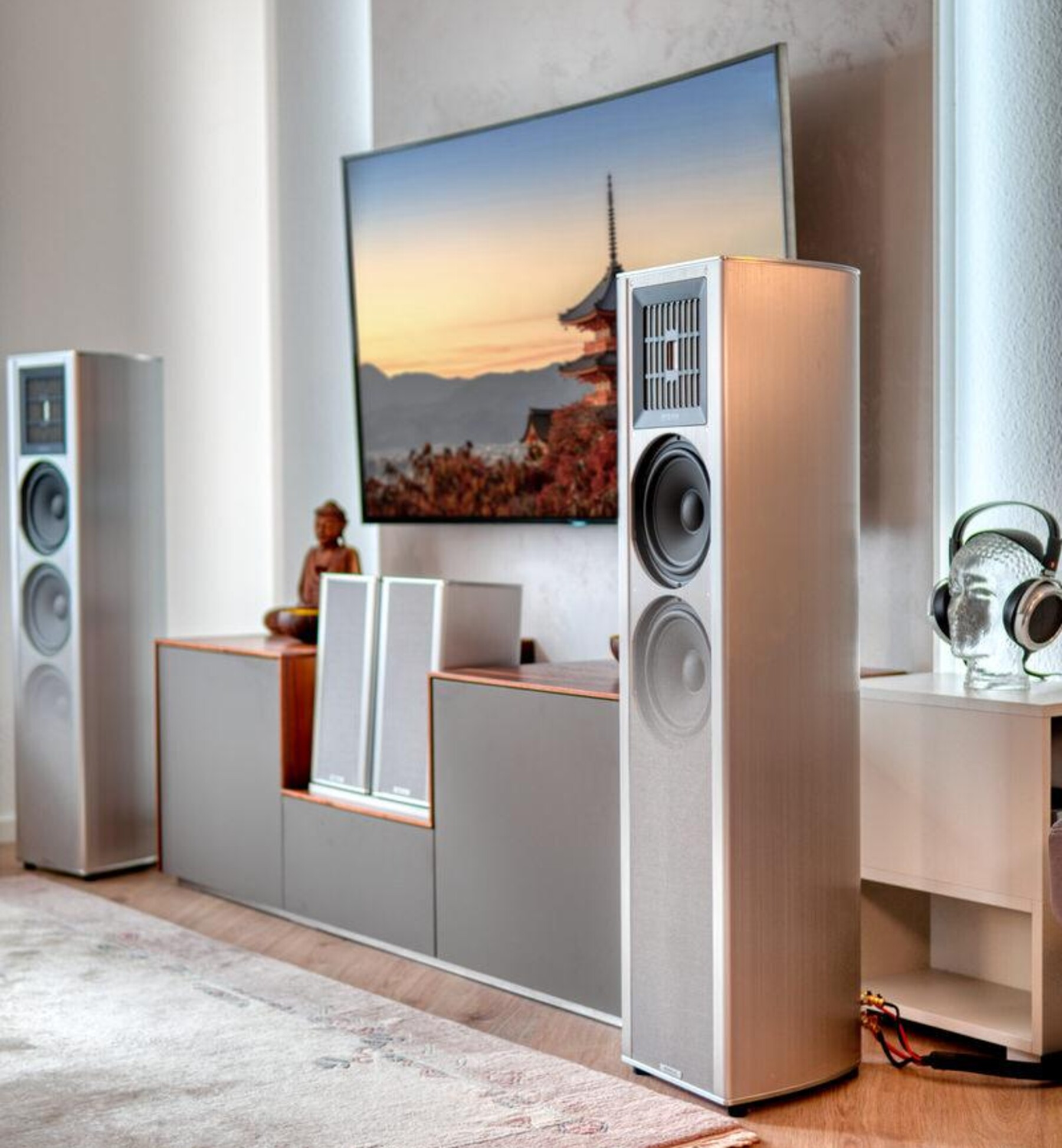 Links und rechts daneben sind die beiden PIEGA COAX 711 angeordnet. Sie sorgen für kraftvollen, aber reinen Klang. Die Schweizer Lautsprecher-Manufaktur PIEGA hat sich in den letzten Jahrzehnten vom Geheimtipp zur ersten Adresse und vor allem zum Trendsetter im Bereich audiophiler und gleichzeitig lifestyliger Wohnraumlautsprecher entwickelt. PIEGA Lautsprecher stehen zum einen für absolut perfekte Verarbeitung in Aluminium und zum Zweiten versteht es PIEGA immer wieder, technologisch neue Benchmarks zu setzen, wie mit dem coaxialen Bändchen-Hoch-Mitteltöner – einem Chassis mit einer Membran aus extrem leichter Aluminium-Folie.