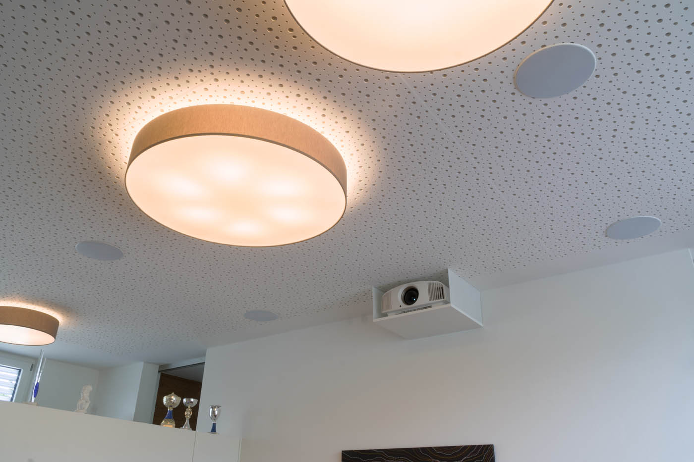 Die Leinwand, eine Stewart 2,5 x 1,4 Meter Luxus Model A Rahmenleinwand (Format 16:9) mit Firehawk G4 Tuch, ist in der Decke der Mediennische verbaut. Das Tuch ist sehr kontrastfähig, eine Anforderung, die aufgrund des hellen Zimmers für einen hohen Bildgenuss nötig ist. Das Bild kommt vom einem Sony Projektor VPL-VW360ES (4k HDR-3D-SXRD Projektor, 4.096 x 2.160 Pixel), der geschickt verkleidet an der Decke sitzt. Das Plateau für den Projektor ist überwiegend aus weiß lackiertem Lochblech – gut für die Lüftung und gleichzeitig schick. Wird die Leinwand nicht genutzt erscheinen zwei dekorative Gemälde in der Mediennische neben dem Kaminofen.
