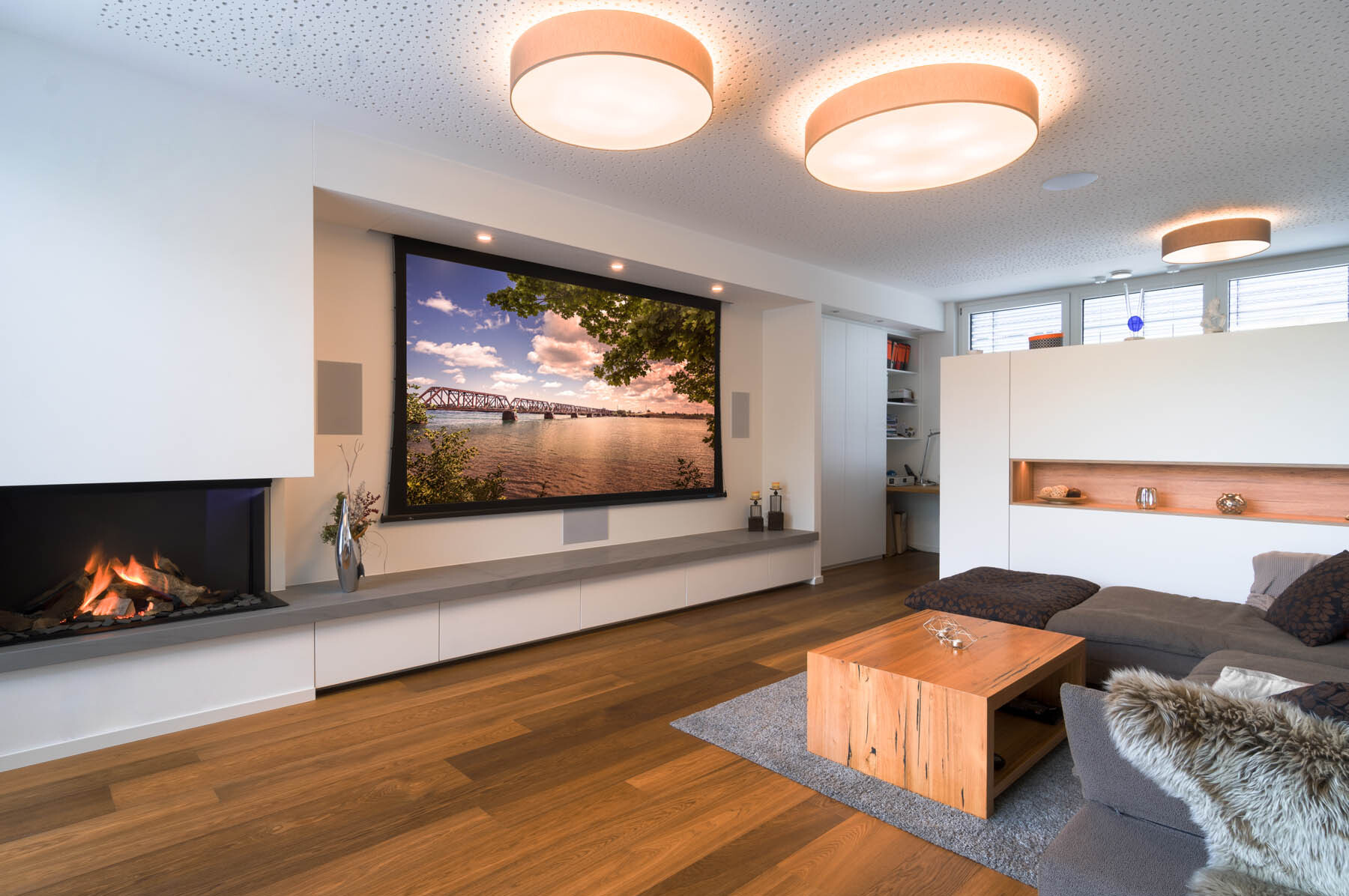 Damit steht dem perfekten Bild- und Tongenuss nichts mehr im Wege: gestochen scharfe 4K-Projektion, immersiver 3D-Sound und voll integrierte Medientechnik verschmelzen zu einem ganzheitlichen Erlebnis im Wohnraum. Besonders in Kombination mit dem dekorativen Kamin entsteht eine einzigartige Atmosphäre, die modernes High-End-Heimkino mit echter Wohnlichkeit verbindet.