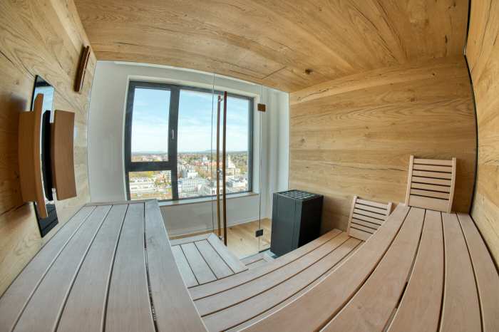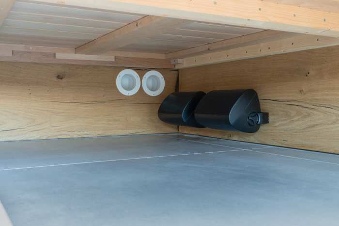 Auch die Sauna stellte bei diesem Projekt eine besondere Herausforderung dar: Extreme klimatische Bedingungen mit großer Hitze, hoher Luftfeuchtigkeit und anschließenden Phasen von Abkühlung und Trockenheit verlangen der Technik alles ab. Gerade Lautsprecher reagieren auf solche Umwelteinflüsse äußerst sensibel. Um sowohl die Langlebigkeit der Komponenten als auch die hochwertige, ruhige Sauna-Atmosphäre zu gewährleisten, wurde bewusst auf klassische Einbau-Lautsprecher verzichtet. Stattdessen kamen speziell dafür geeignete Lautsprecher zum Einsatz, die fürs Auge nsichtbar unter den Saunaliegen installiert wurden. So bleibt der Klang präsent und gleichmäßig im Raum, ohne das klare, reduzierte Design der Sauna zu stören – eine elegante Lösung, die Technik und Entspannung perfekt miteinander verbindet.