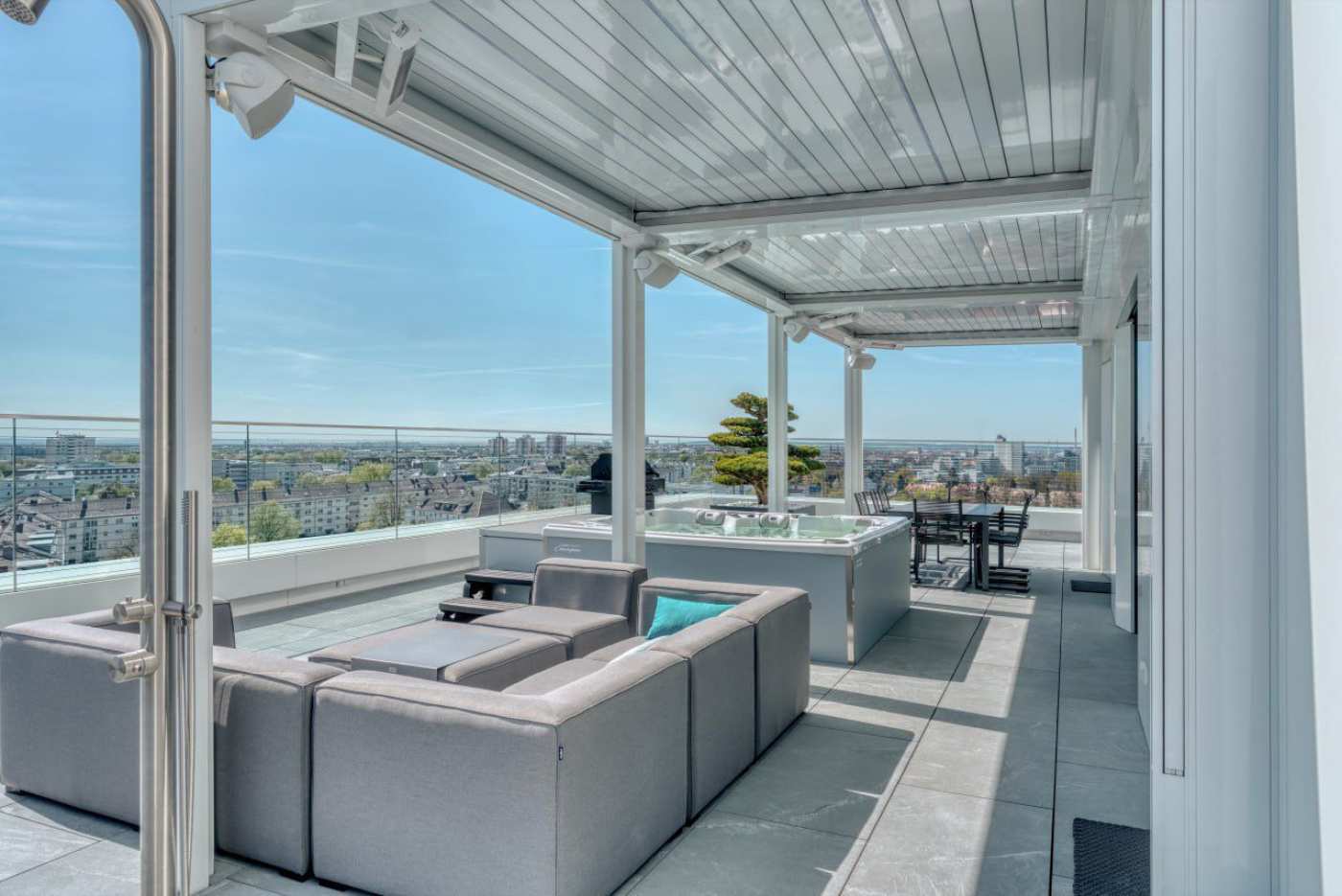 Ein besonderes Highlight des Penthouses ist die großzügige Terrasse, die als erweiterter Wohnraum konzipiert wurde und entsprechend auch in das ganzheitliche Audiokonzept eingebunden ist. Gerade in dieser exponierten Lage, hoch über den Dächern Frankens, spielt Musik eine zentrale Rolle – sei es zur dezenten Untermalung entspannter Stunden oder als klangvolle Begleitung geselliger Abende. Entsprechend hoch waren die Anforderungen an Klangqualität, Belastbarkeit und Wetterfestigkeit.