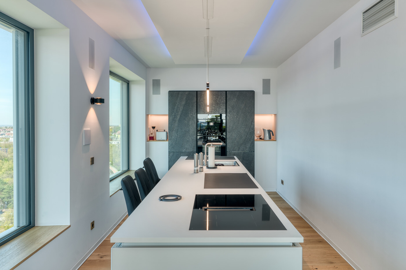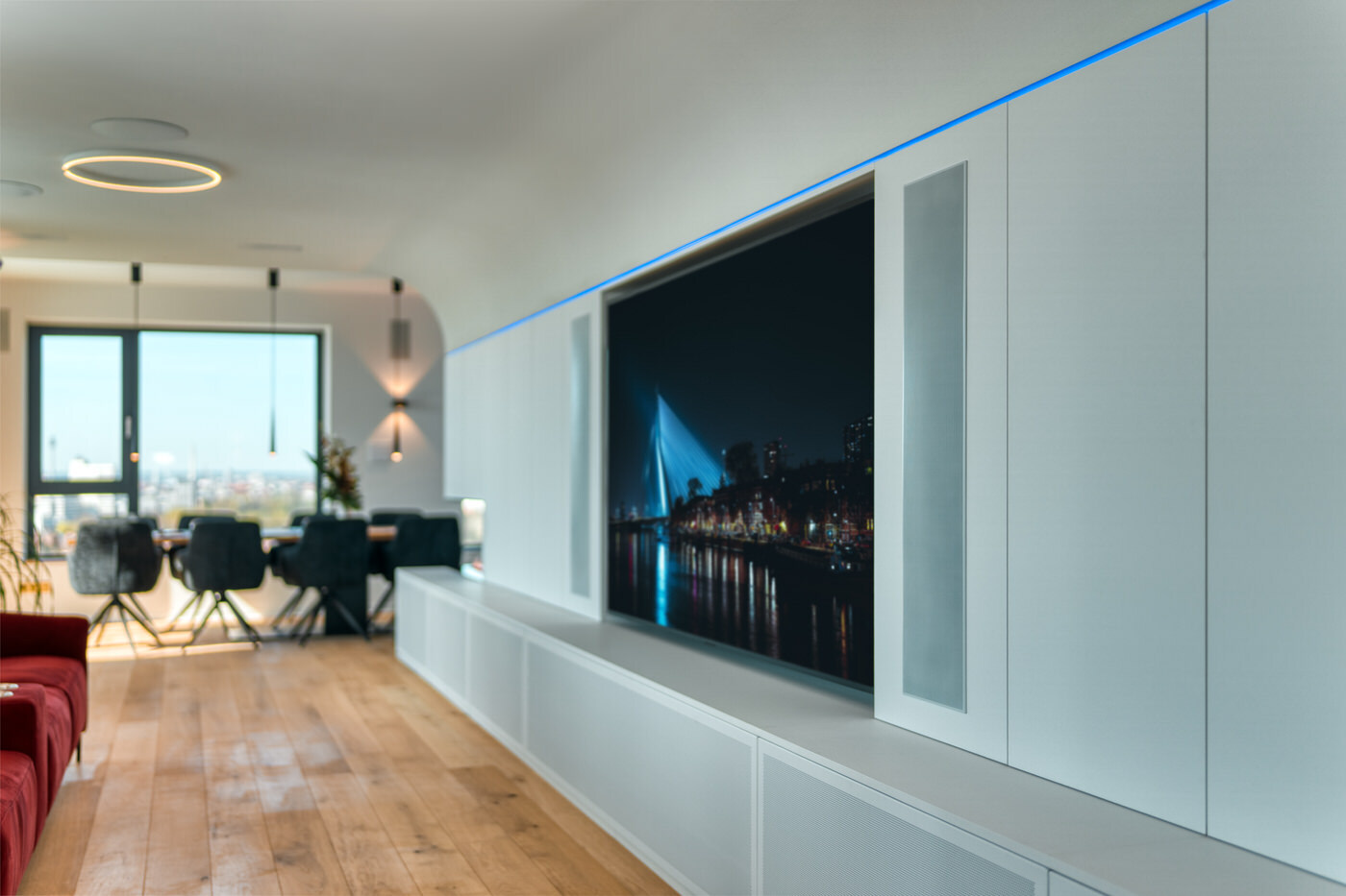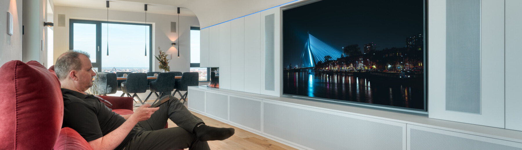 Ein besonderes Augenmerk lag auf der hochwertigen Audio- und Videoinstallation. Im Wohnbereich sollte ein kompromissloses High-End-Erlebnis entstehen, das sowohl für entspanntes Musikhören als auch für beeindruckende Filmabende geeignet ist. Gleichzeitig war es dem Bauherrn wichtig, dass Musik nicht auf einen einzelnen Raum beschränkt bleibt. Ob auf der großzügigen Terrasse, in weiteren Wohnbereichen oder in privaten Rückzugsorten des Penthouses – der Klang sollte überall verfügbar sein, jederzeit abrufbar und komfortabel steuerbar.