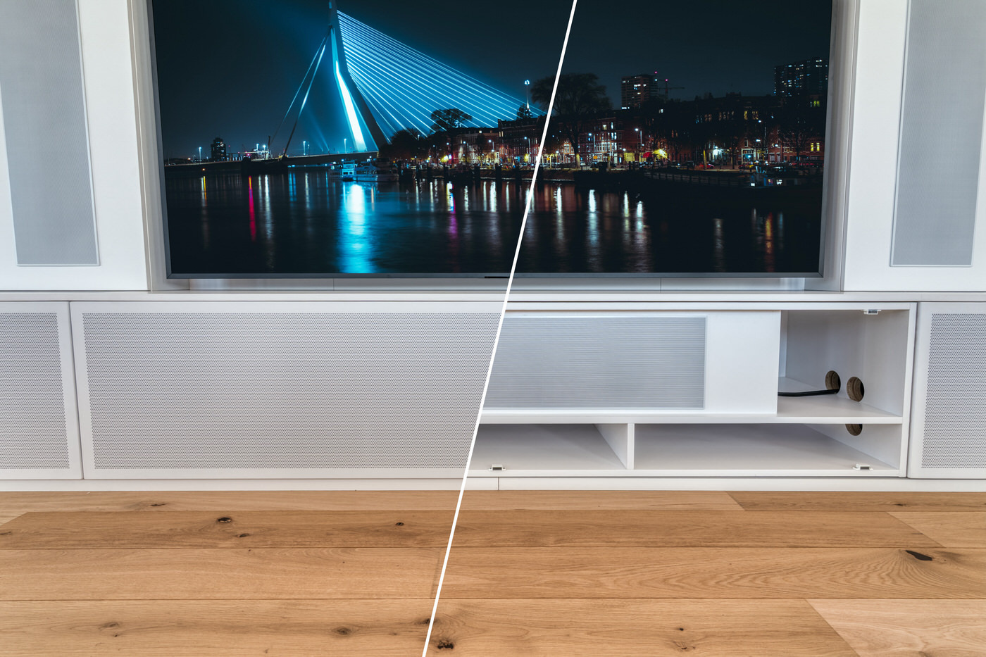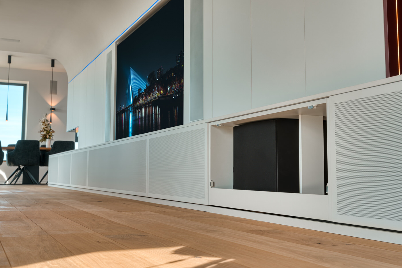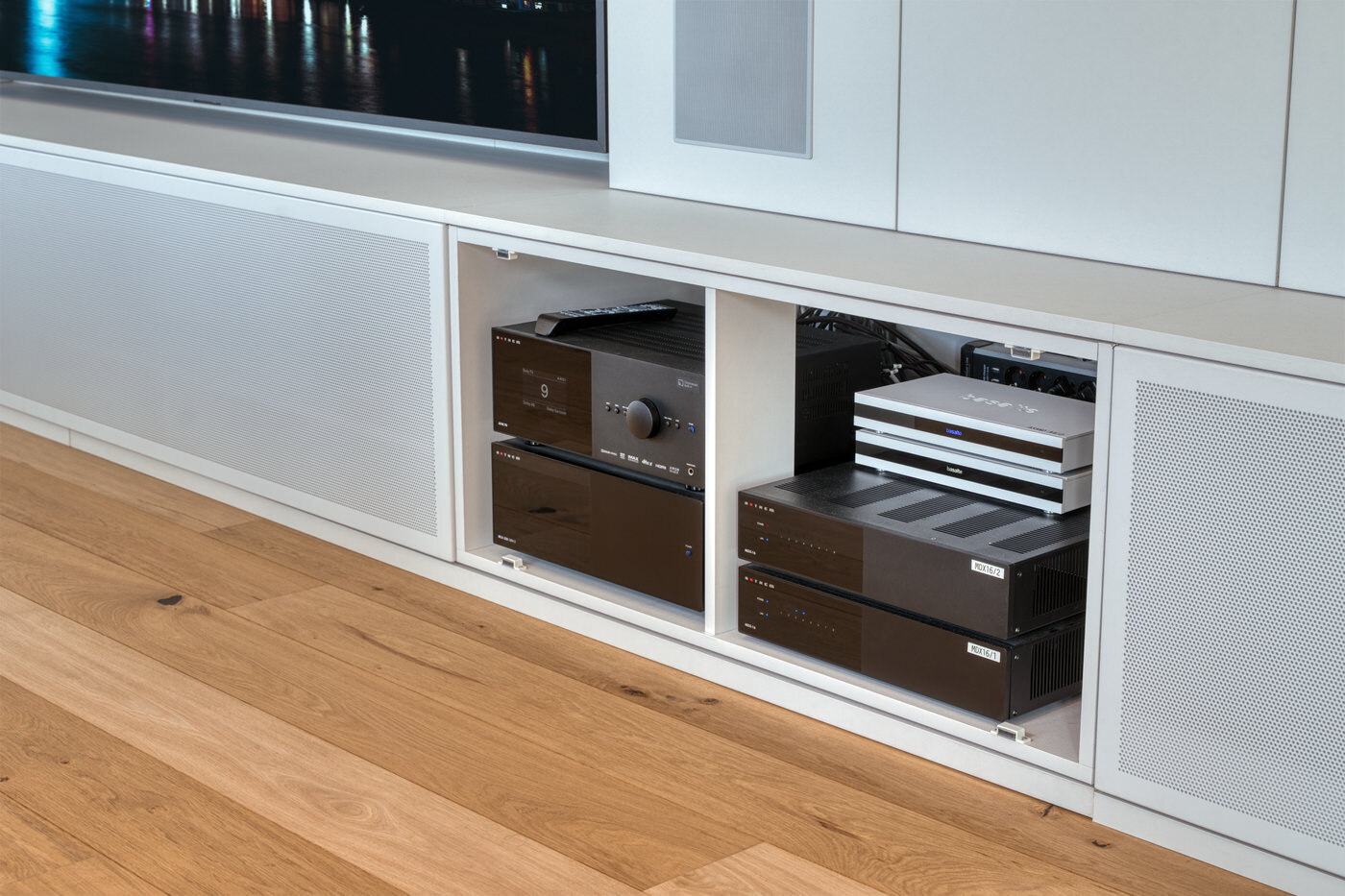 Auch die komplette Elektronik findet in den maßgefertigten Unterschränken ihren Platz. Verstärker, Zuspieler und Steuerungskomponenten sind sauber integriert, gut belüftet und dennoch jederzeit zugänglich. Sichtbare Technik bleibt dem Raum damit erspart, während im Hintergrund ein leistungsfähiges und perfekt abgestimmtes System arbeitet, das den hohen Anspruch dieses Projekts konsequent unterstreicht.