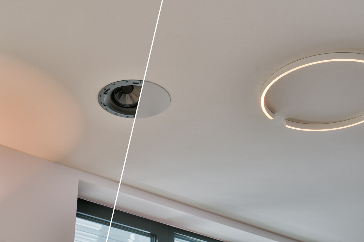 Ergänzend dazu sind über dem Hörplatz im TV-Bereich zwei weitere Lautsprecher in die Decke integriert, deren bündig eingelassene Abdeckgitter nahezu unsichtbar mit der Deckenfläche abschließen. Hinter dieser dezenten Optik verbergen sich speziell angewinkelte Lautsprecher, die gezielt nach vorne abstrahlen und so den Rear-Sound aus der Decke realisieren – eine ebenso unauffällige wie wirkungsvolle Lösung, um ein immersives Surround-Erlebnis zu erzeugen, ohne sichtbare Rear-Lautsprecher im Raum platzieren zu müssen.