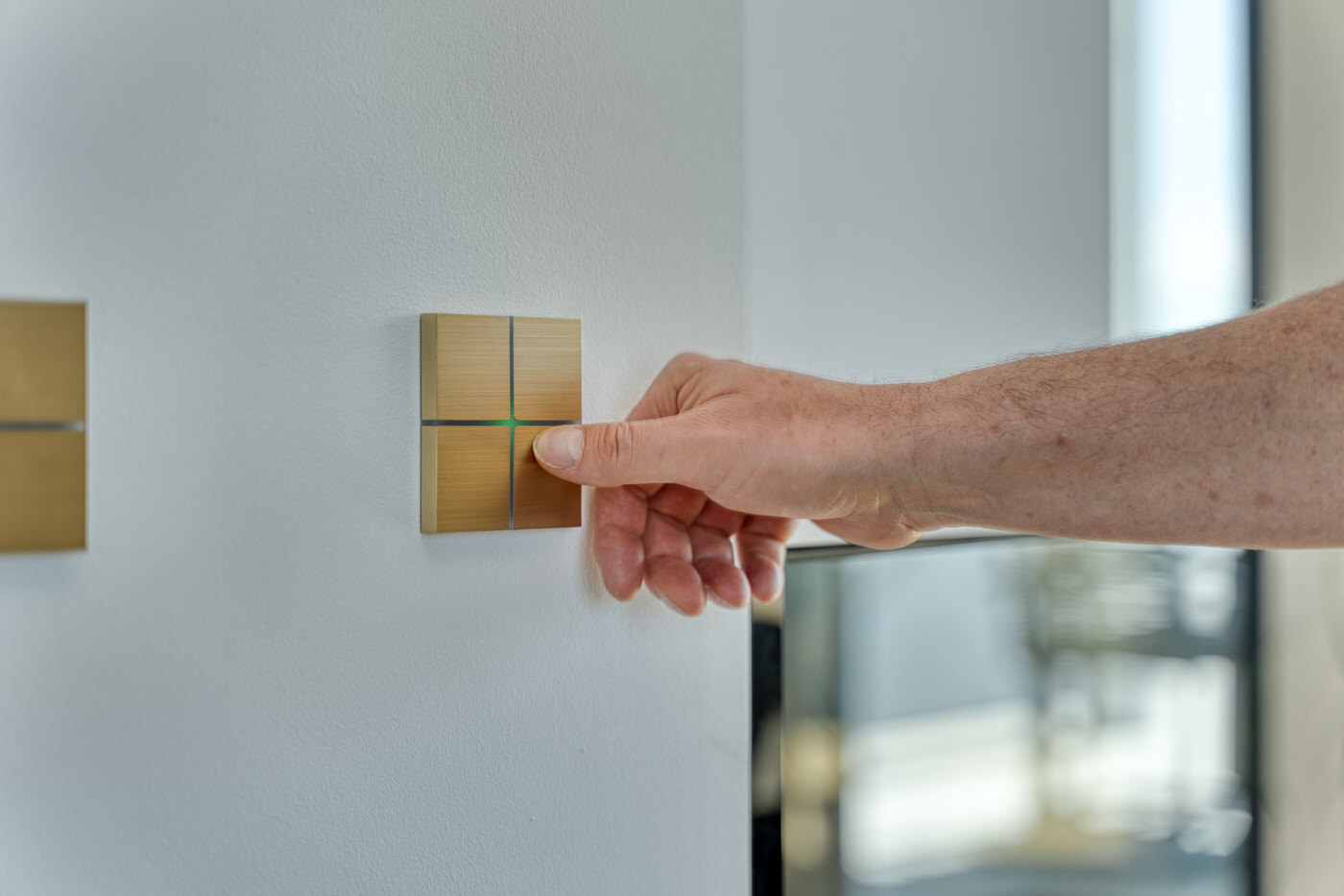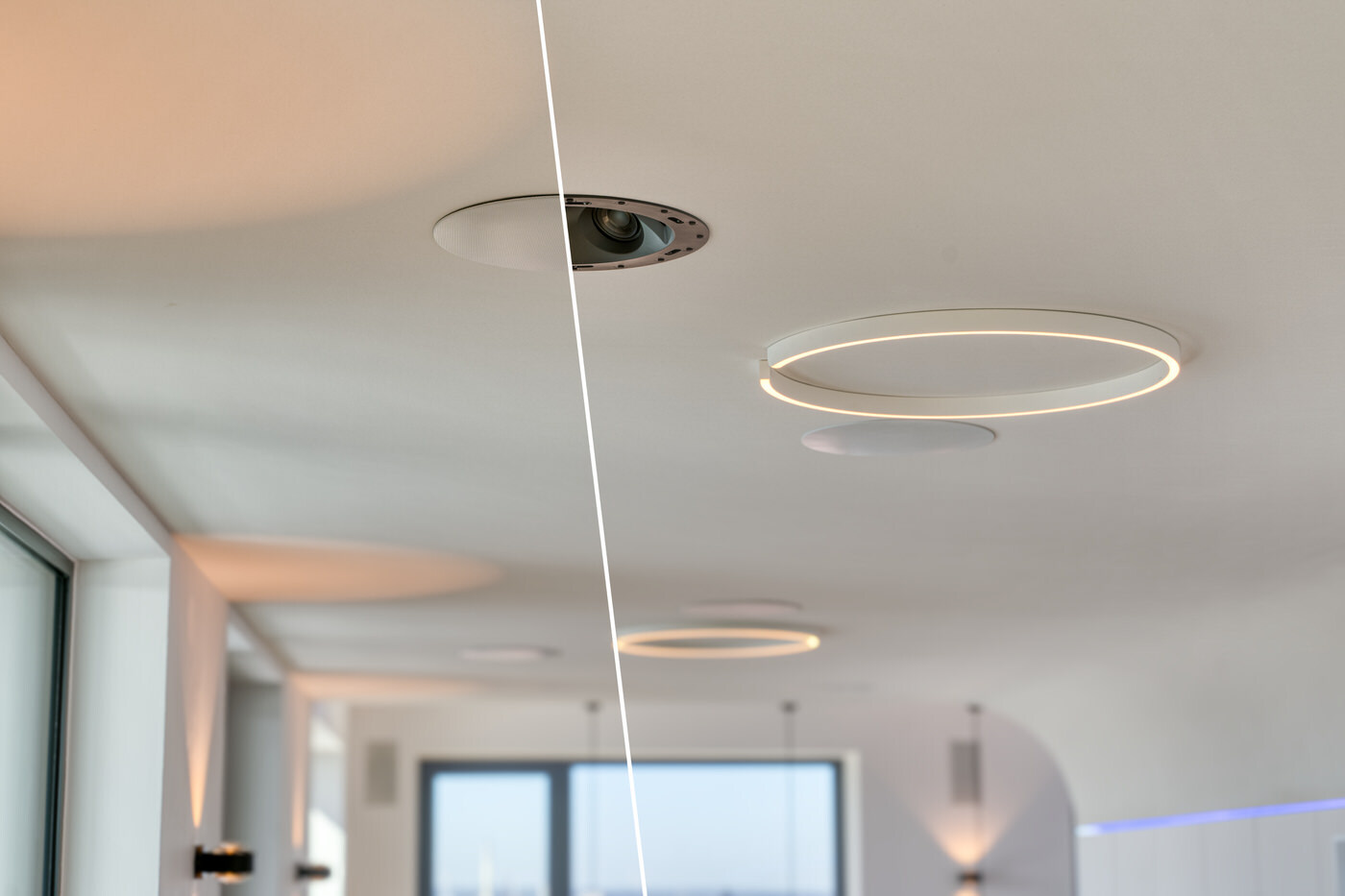 Ziel war es, eine vollständig integrierte Haussteuerung zu realisieren, die sämtliche Medien-, Bild- und Tonkomponenten zentral verwaltet und dabei so unauffällig wie möglich in die Architektur eingebettet ist. Technik sollte hier nicht dominieren, sondern sich bewusst zurücknehmen. Sichtbare Geräte, Kabel oder klassische Lautsprecheraufstellungen waren nicht gewünscht – stattdessen eine klare, reduzierte Optik, bei der der Wohnraum im Mittelpunkt steht und die Technik im Hintergrund ihre Arbeit verrichtet.