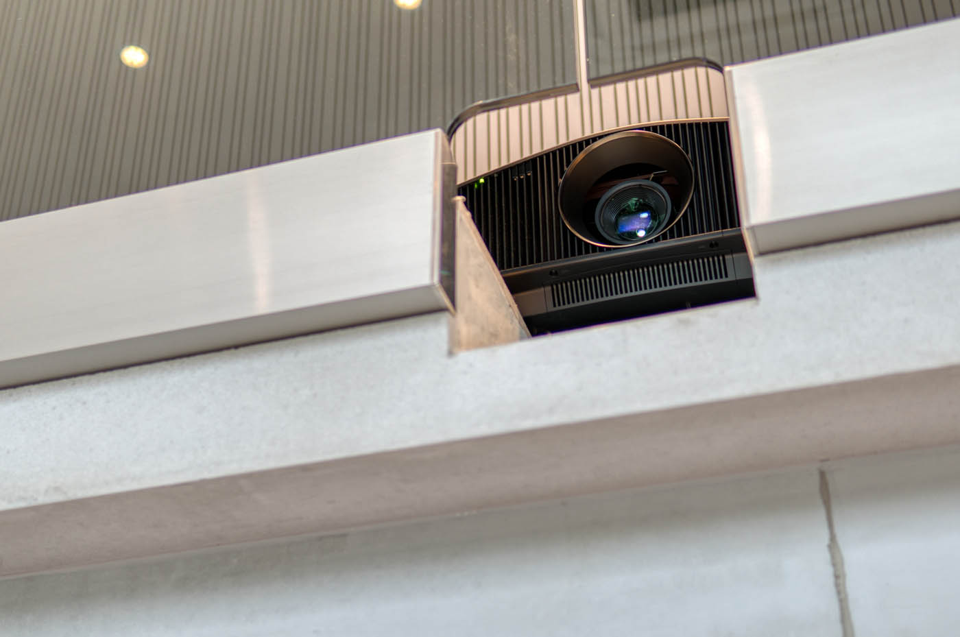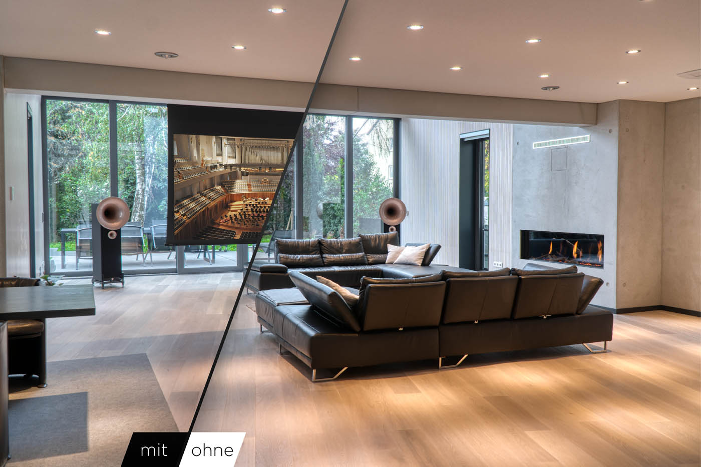 Die Lösung musste daher zwei Anforderungen perfekt miteinander verbinden: ein erstklassiges Kinoerlebnis bei Nutzung des Systems und gleichzeitig volle Transparenz und Offenheit des Raumes im Alltag.