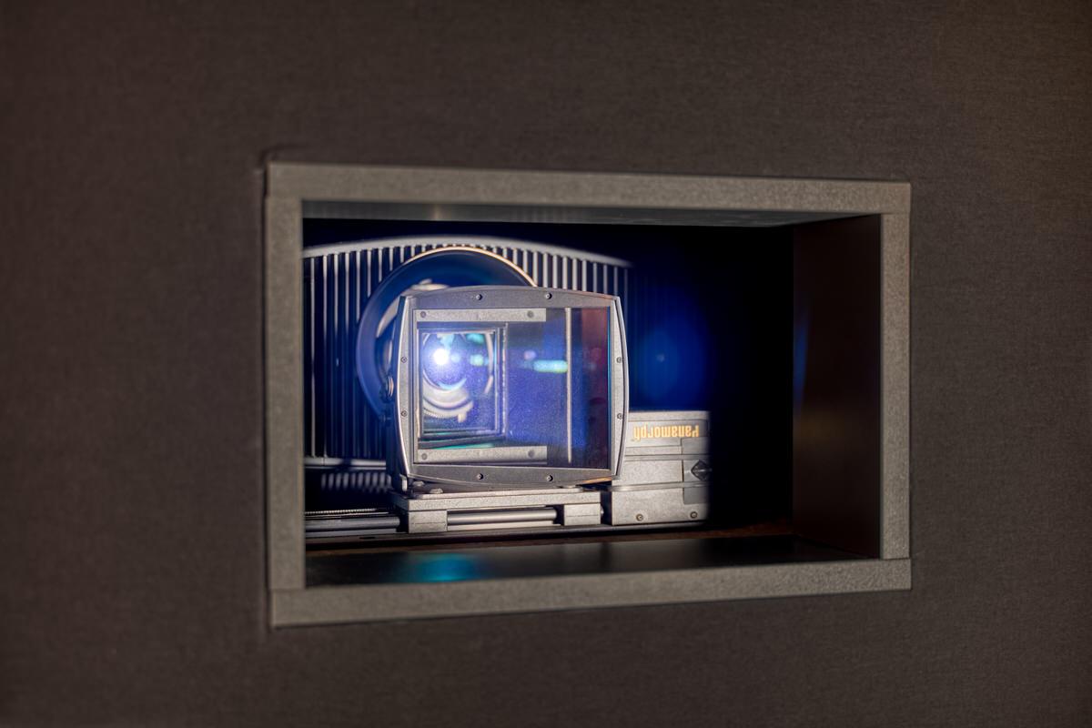 Das Bild kommt von einem 4k SONY VPL-VW760ES Laserprojektor, der in einem separaten Bereich untergebracht ist. So kann kein Lüftergeräusch das Kinoerlebnis akustisch beeinträchtigen. Vor dem Projektor sitzt eine anamorphotische Linse DC1 von Panamorph auf einem motorischen Schlitten. Damit kann bei Kino-Filmen im 21:9-Format auf Knopfdruck die beste Breitbild-Qualität auf die Leinwand gebracht werden.