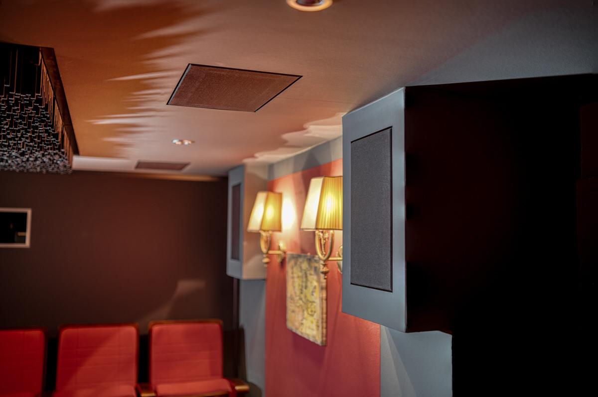 Dem Sound kommt in einem solchen immersiven Kino natürlich eine besondere Rolle zu, er soll ja – wie der Name schon sagt – unter die Haut gehen. Wie bereits erwähnt, fiel die Wahl auf Lautsprecher von Ascendo Immersive Audio. Mit diesen Sound-Systemen wird man regelrecht in die Handlung versetzt und ist Teil des Geschehens mit allen Emotionen, die Gänsehaut oder Tränen vermitteln können. Dies gilt für Film, Musik oder 3D-Spiele. Emotionen sind nicht steuerbar, aber sie sind das Maß für eine Realität der Wiedergabequalität, die nur dann auch unter die Haut gehen kann. Der Sound ist als Lautsprechersystem 9.3.4 konzipiert. Hinter der mikroperforierten, akustisch transparenten Leinwand sind die Front-Lautsprecher platziert. Dies sind drei ASCENDO CCRM12 mk II-V Aktivlautsprecher. So kommt der Film-Ton besonders authentisch „aus dem Bild“. Den Surround-Sound generieren sechs ASCENDO CCRM 6 P mit DNA1000.2 Endstufen. Dazu kommen vier ASCENDO CCRM 6 P mit DNA1000.2 Endstufen für Dolby Atmos in der Decke des Kinos. Last, but not least sorgen drei ASCENDO SMS G15 Subwoofer für einen sehr präzisen Bass, der spürbar ist.