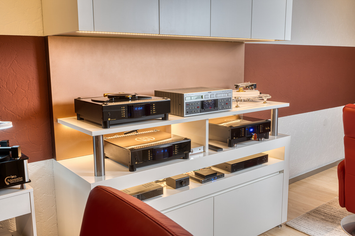Als Wiedergabegeräte für Analogquellen finden sich im Bestand des Kunden ein hochwertiges Cassettendeck des Schweizer Magnetbandspezialisten Revox – das B 215 – sowie ein Clearaudio-Plattenspieler mit Tangentialarm. Alle Quellen verwaltet der Vorverstärker MBL 5011 und gibt deren Signale an die MBL-Endstufen 9008 weiter. Für tagesaktuelles TV-Programm sind ein Satelliten-TV-Empfänger sowie Apple TV mit ihm und dem Sony-Beamer verbunden.