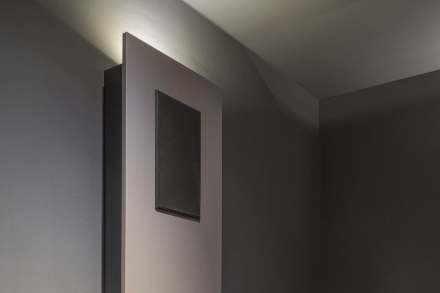 Die maßgefertigten Wandpaneele übernehmen gleich mehrere Funktionen und sorgen für ein konsequent aufgeräumtes und funktionales Raumdesign. Sie integrieren nicht nur die Surround-Lautsprecher, sondern auch die indirekte Beleuchtung, wodurch eine harmonische Verbindung aus Akustik und Lichtgestaltung entsteht und der technische Charakter des Raumes optisch in den Hintergrund tritt.