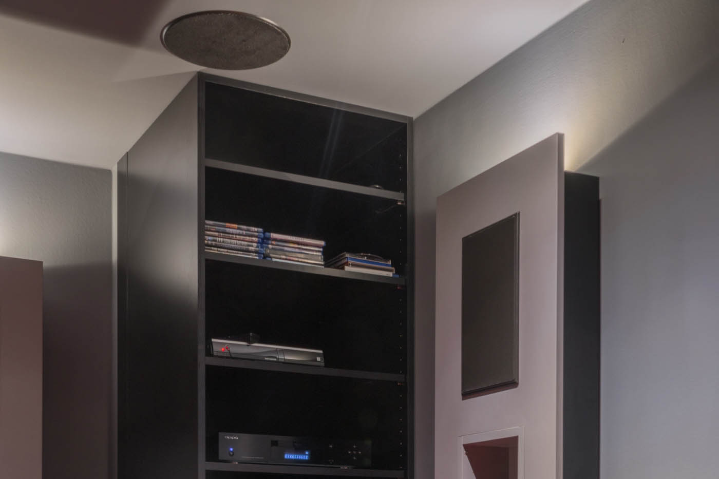 Die AV-Möbel im Kino sowie das Podest für die authentisch gestalteten Kinostühle wurden als präzise Schreineranfertigungen umgesetzt und fügen sich nahtlos in das Gesamtkonzept ein. Die seitlichen und rückwärtigen Raumstrukturen wurden gezielt zur Integration der In-Wall-Surround-Lautsprecher genutzt und fungieren gleichzeitig als akustisch wirksame Diffusoren zur Optimierung der Raumakustik. Ergänzt wird das durch einen langflorigen Teppich sowie eine professionell installierte Kinoleinwand, die gemeinsam für ein stimmiges, immersives Heimkinoerlebnis sorgen.