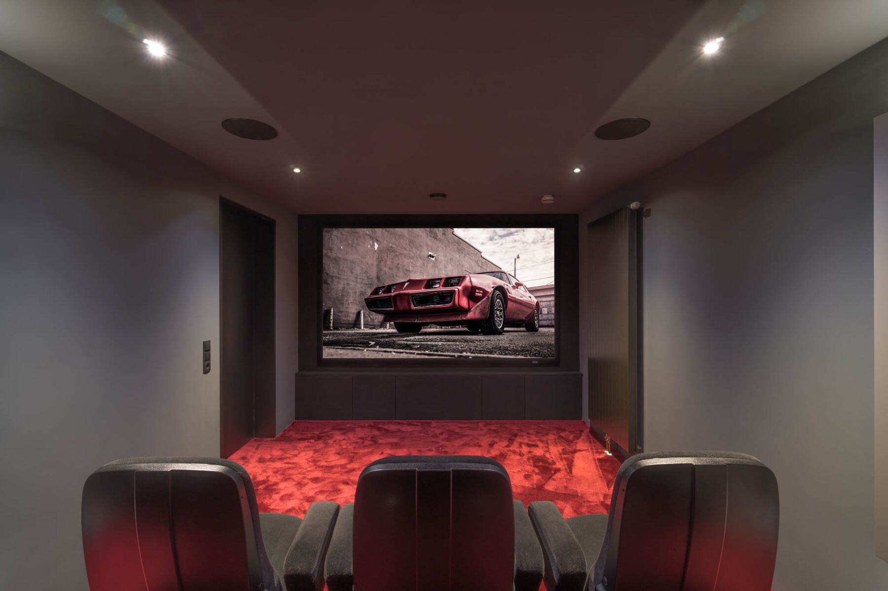 Ein roter Teppich für echte Kinofans: Das „Red Carpet Cinema“ im Keller ist ein beeindruckendes Beispiel für ein maßgeschneidertes Heimkino. Bereits in der Planungs- und Bauphase des Hauses wurde der Raum konsequent auf professionelle Heimkino-Anforderungen ausgelegt, um ein immersives Kinoerlebnis in den eigenen vier Wänden zu ermöglichen.