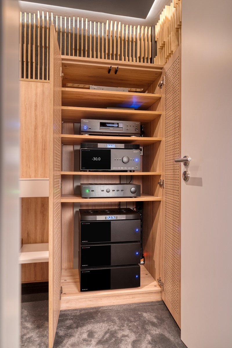 Die Elektronik-Komponenten finden in einem der maßgefertigten Schränke komfortabel Platz und sind so auch nicht sichtbar.