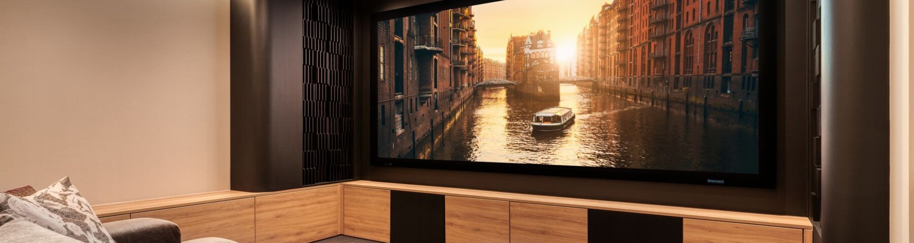 Die Leinwand kommt von den Hollywood-Profis von Stewart. Wer höchste Ansprüche an Bildqualität stellt, wählt mit Stewart die weltbeste Leinwand für sein Heimkino. In diesem Kino ist es eine Stewart CIMA Wallscreen Rahmenleinwand im 21:9 Format und 3.050 mm Bildbreite, mikroperforiert mit dem Studiotek100 Tuch für akustische Durchlässigkeit.